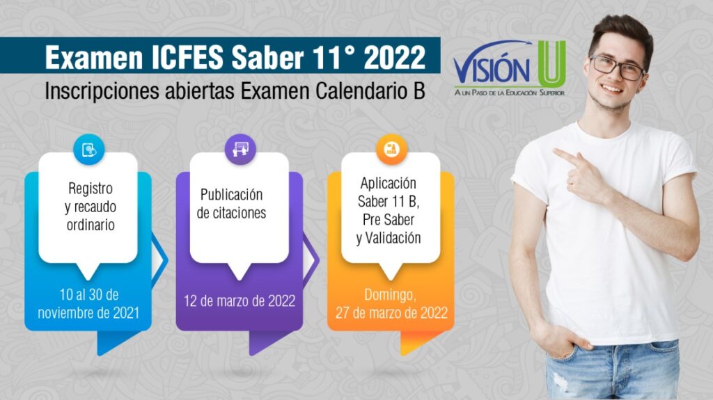 El Instituto Colombiano para la Evaluación de la Educación – ICFES anunció la apertura del proceso de inscripción para las pruebas Saber 11 calendario B, Pre Saber y Validación del Bachillerato Académico, que se realizarán en sitio, el domingo 27 de marzo de 2022, bajo la modalidad lápiz y papel;  la prueba de ensayo Pre Saber, que familiariza a los estudiantes con el tipo de preguntas y el ambiente de la prueba Saber 11, se desarrollará adicionalmente bajo la modalidad electrónica en casa, el mismo día.